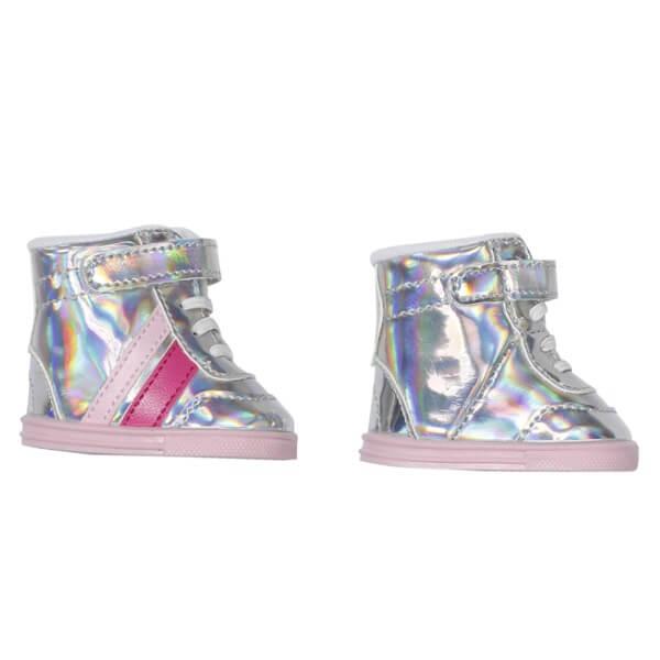 Перламутровые кеды для куколки Бэби Борн 43 см. Спереди имитация шнуровки, есть застежка на липучке. Цвет розовый.